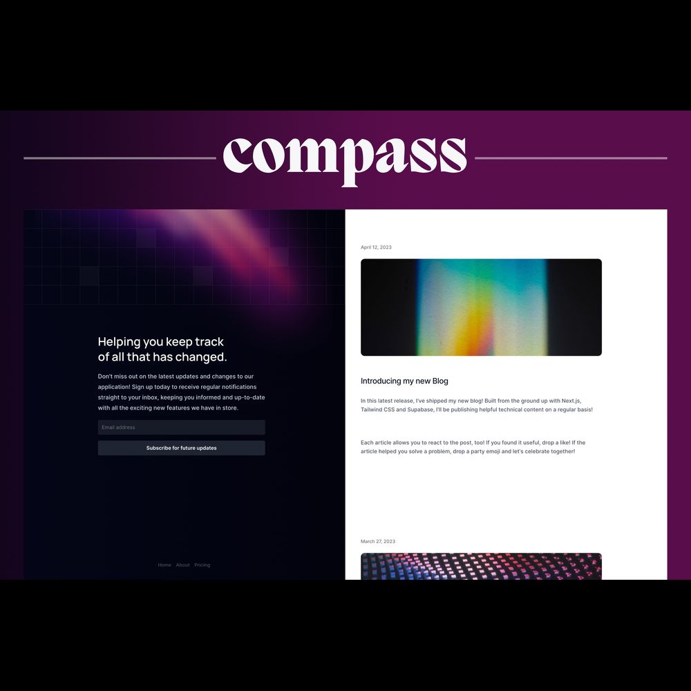 Compass is a simplistic yet unique template to display changes to a website or application. With support for light and dark mode, users can easily read about changes and even subscribe to a newsletter so they can be the first to know when new changes ship!Live preview: https://feedback-arise-288466.framer.app/