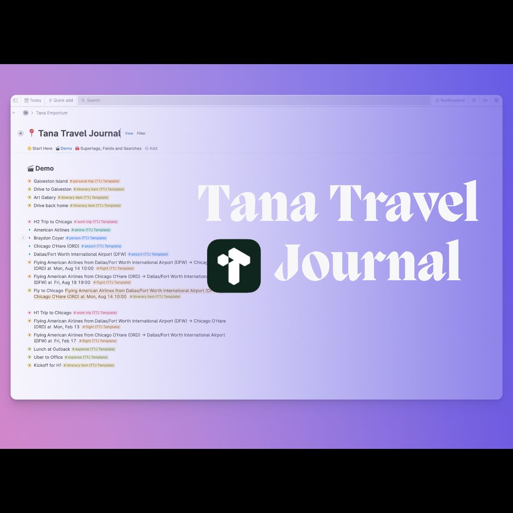 This Tana template has everything you need to organize your personal and work trips, including flights, expenses, itineraries, airlines and airports, and more!Demo video: https://youtu.be/dwBwG_dLFX8