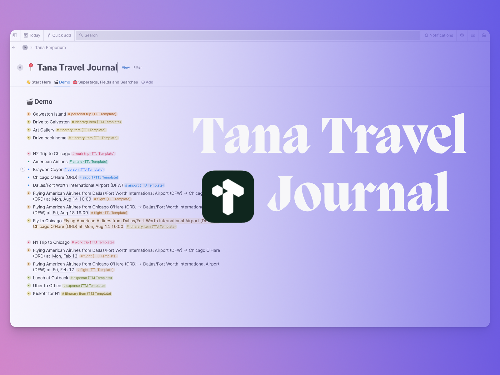 This Tana template has everything you need to organize your personal and work trips, including flights, expenses, itineraries, airlines and airports, and more!Demo video: https://youtu.be/dwBwG_dLFX8