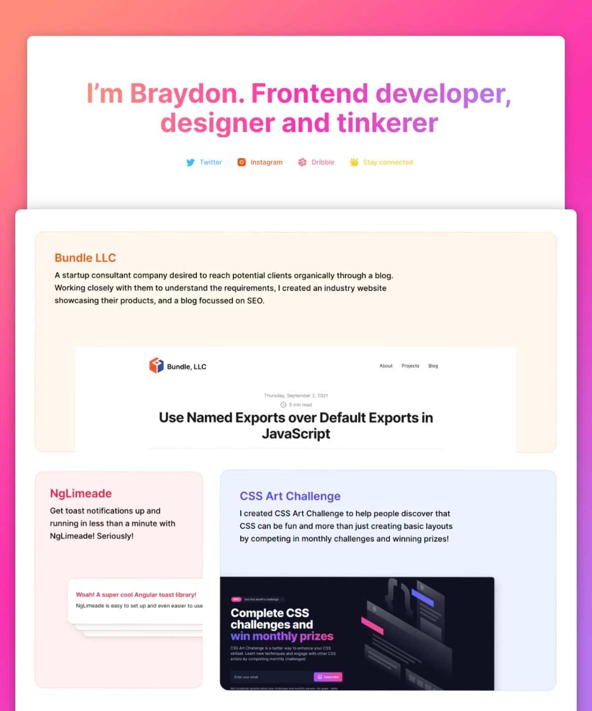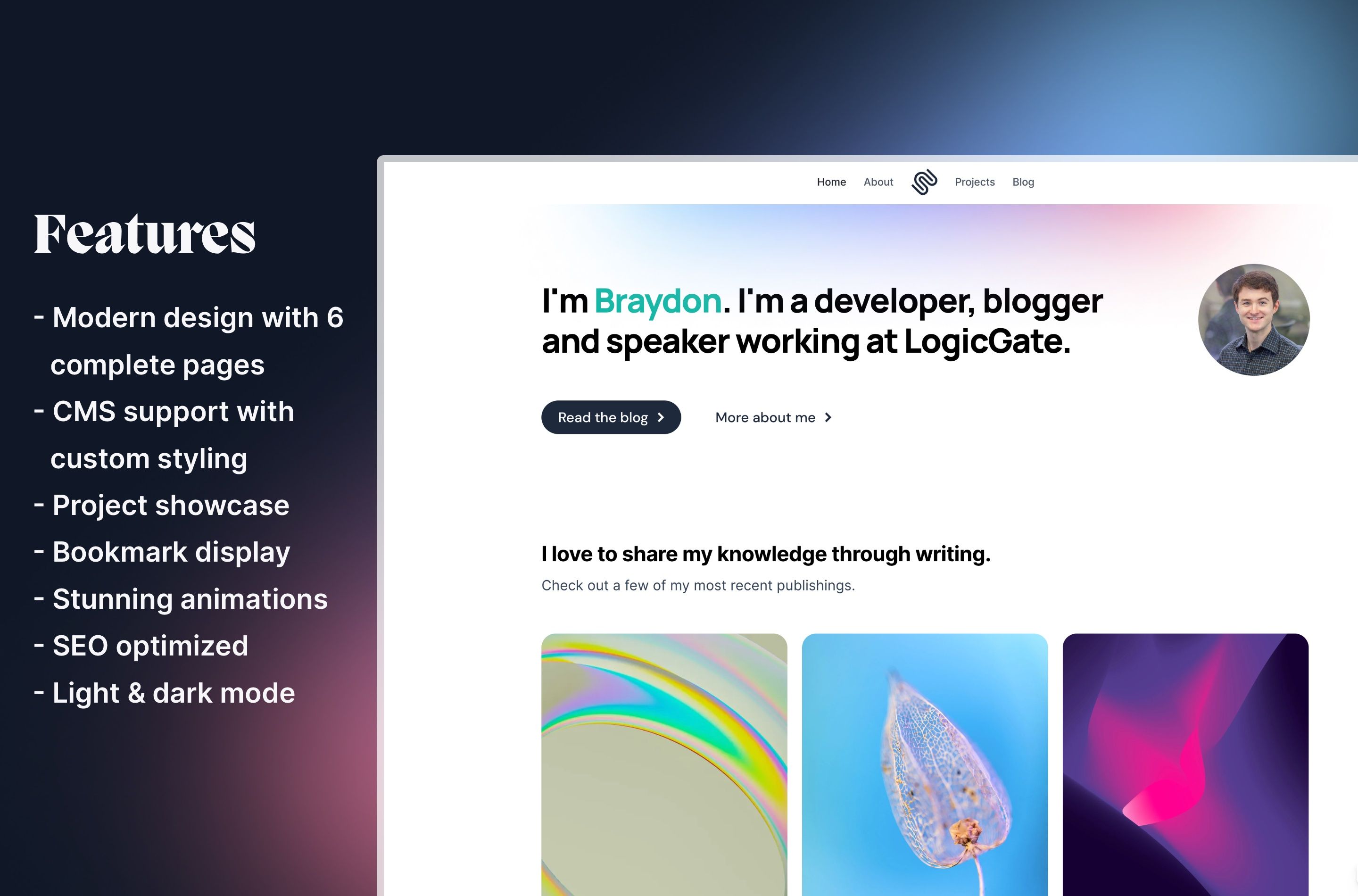 Unleash your creativity and establish an online presence like never before with Moonstone, the whimsical personal portfolio template designed to set your work apart from the rest. Crafted with a keen eye for aesthetics and functionality, Moonstone brings you a seamless fusion of a stunning portfolio and a powerful custom blog, making it the perfect platform to showcase your talents and unleash your writing prowess. Moonstone includes: - 7 pages, including a speaking page and custom 404 page - A project section to showcase your work - A blog handcrafted with custom colored code-blocks - A toolbox to display your favorite apps and links across the web Demo Blogfolio here: https://technical-mission-858335.framer.app/?via=braydoncoyer